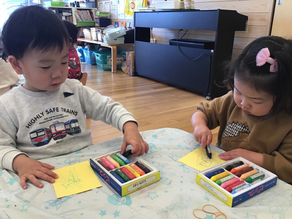 たいこを作っている様子です!クレヨンでお絵かきするのが好きなつくし組さん。自分の好きな色のクレヨンを持って、夢中でお絵描きしています🖍何を書いているのかな~?