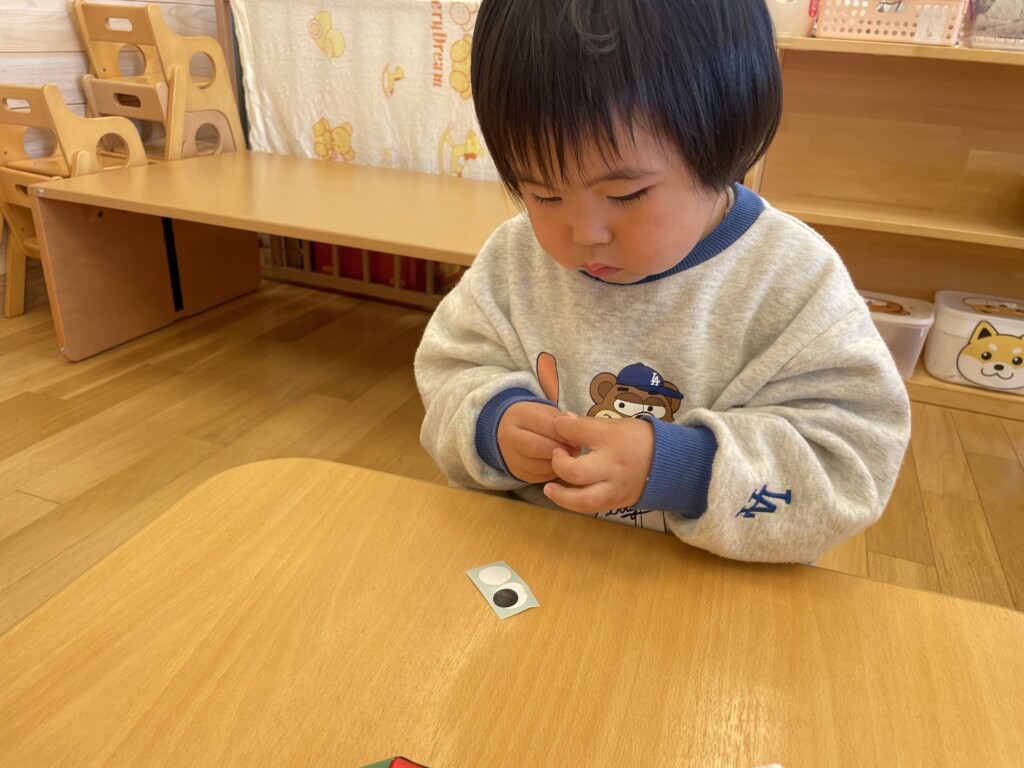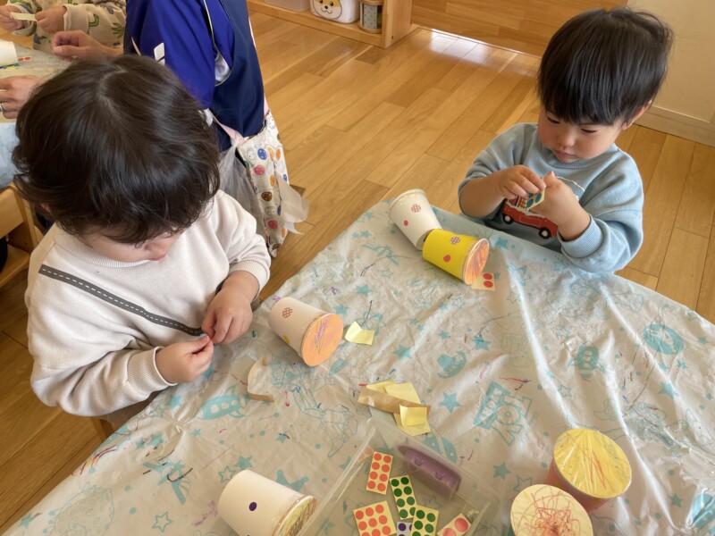 以前は、シールを台紙からはがすのが難しく苦戦していましたが、上手にはがせるようになりました✨はがしたシールを紙コップに貼っていきます!徐々に形が見えてきましたね!