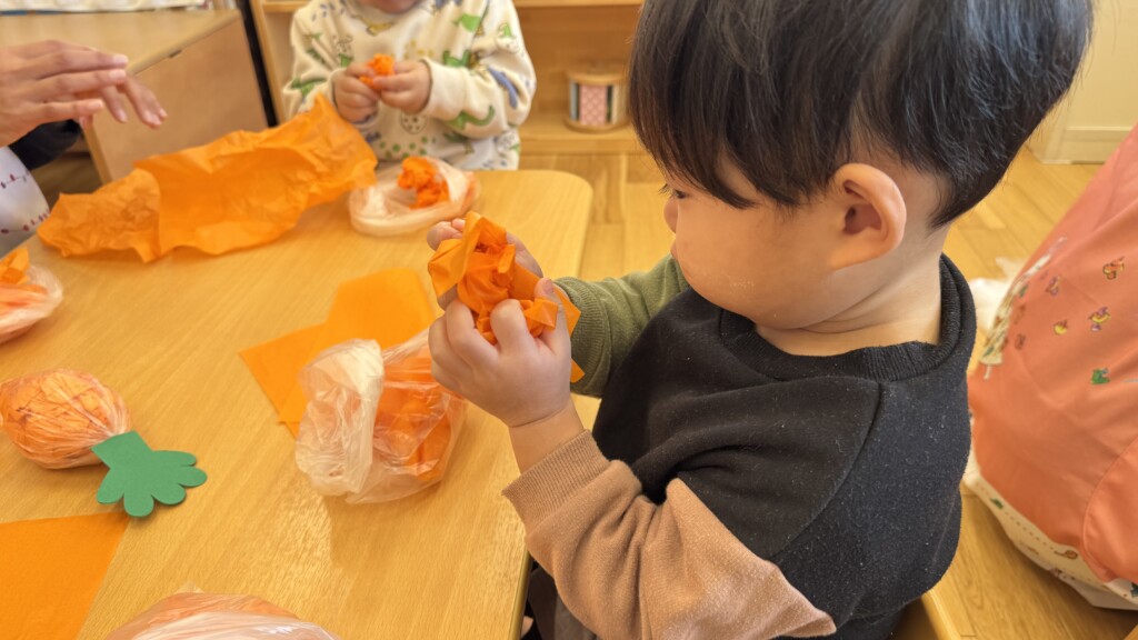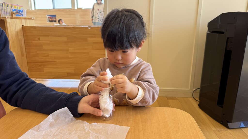 野菜を作っている様子です。ポリ袋に花紙をくしゃくしゃして入れていきます。R1の容器にも挑戦してみました!一本指で上手に入れることができました!