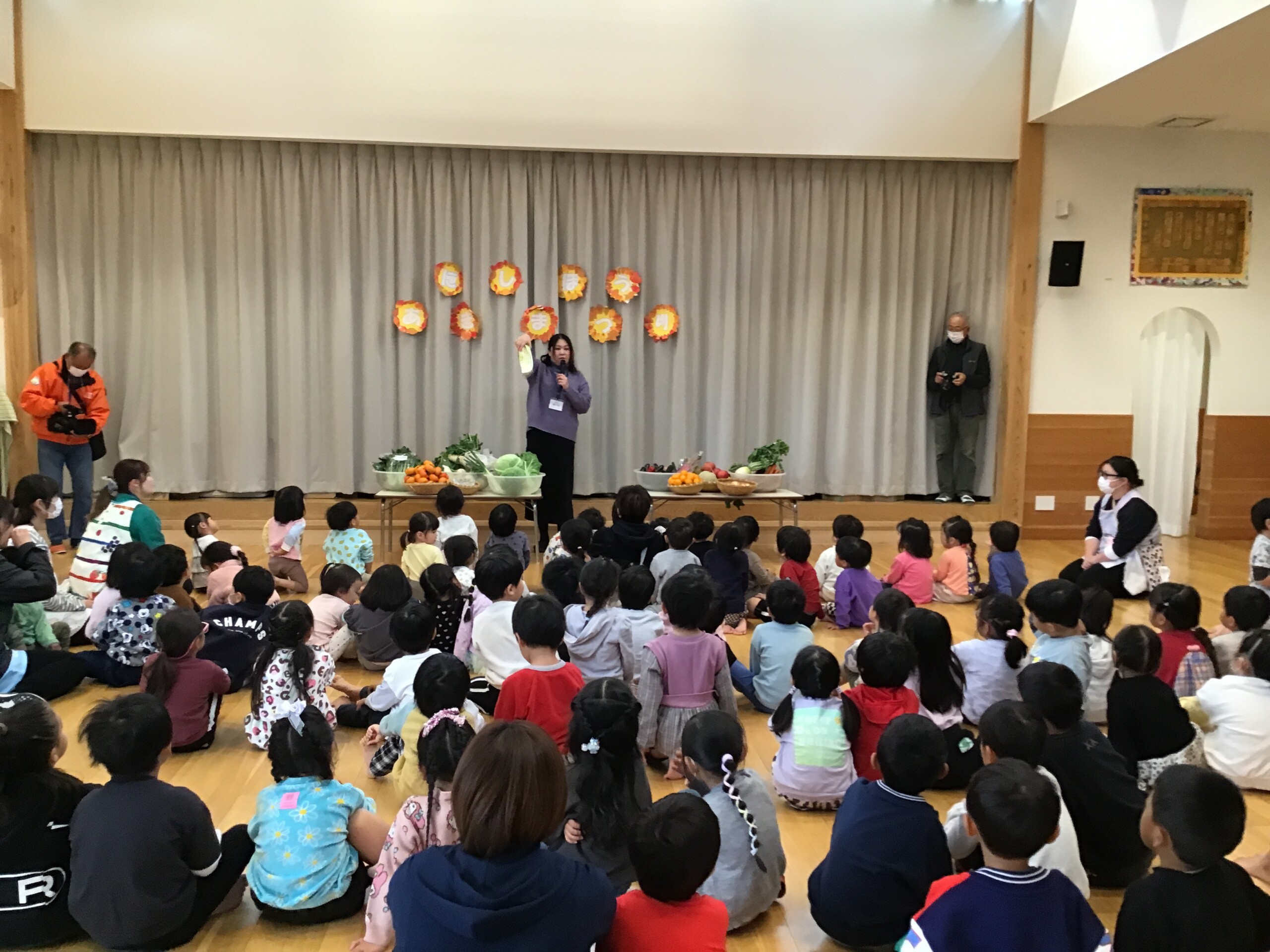 毎年恒例の野菜の名前当てクイズでは、自信満々にたくさんのお友達が答えてくれました🎵中には物珍しい野菜もあり…大人も子どもも興味津々👀「給食の先生にお料理してもらう~!」「給食楽しみ♫」との声も聞こえてきました(^O^)