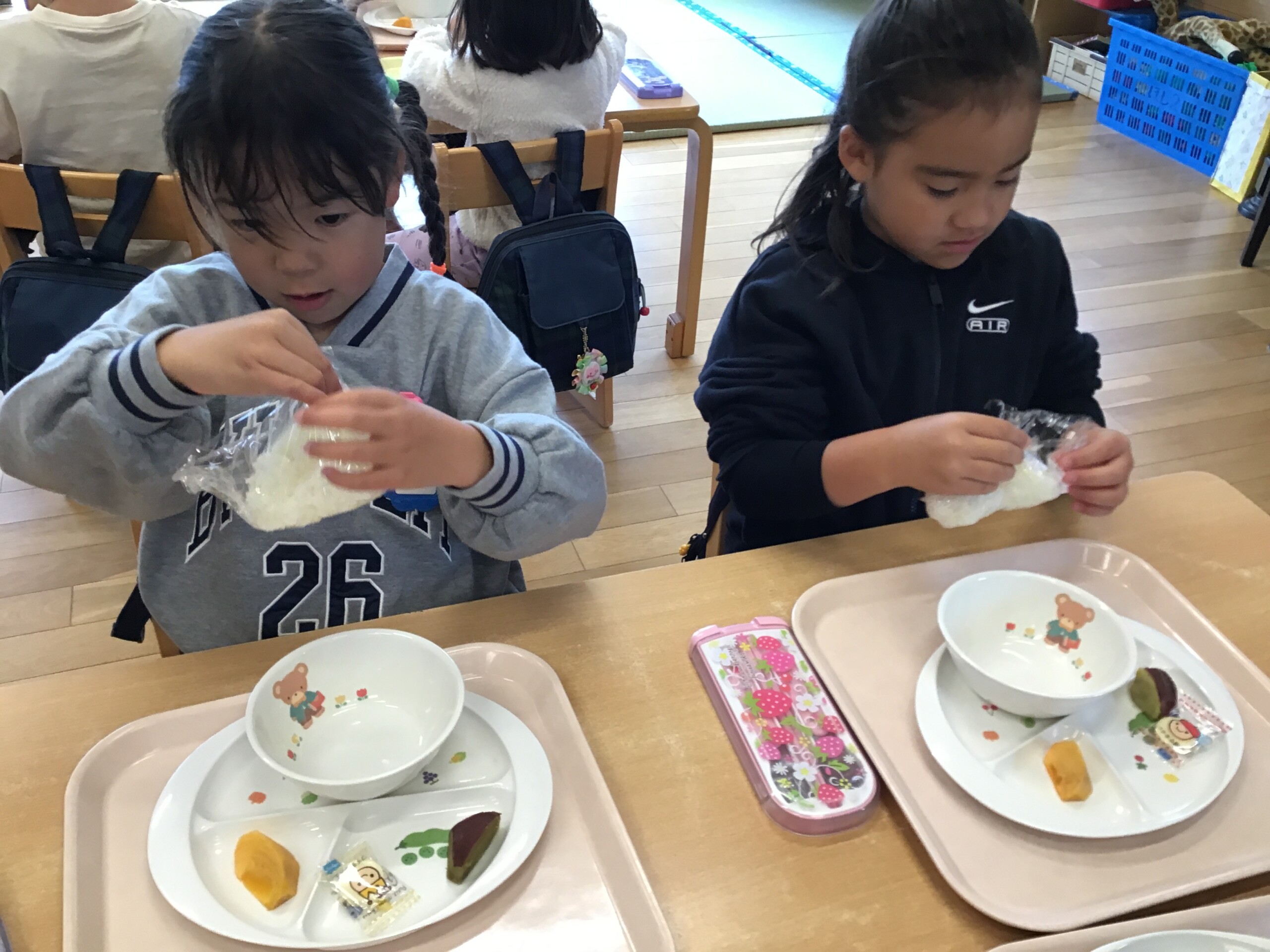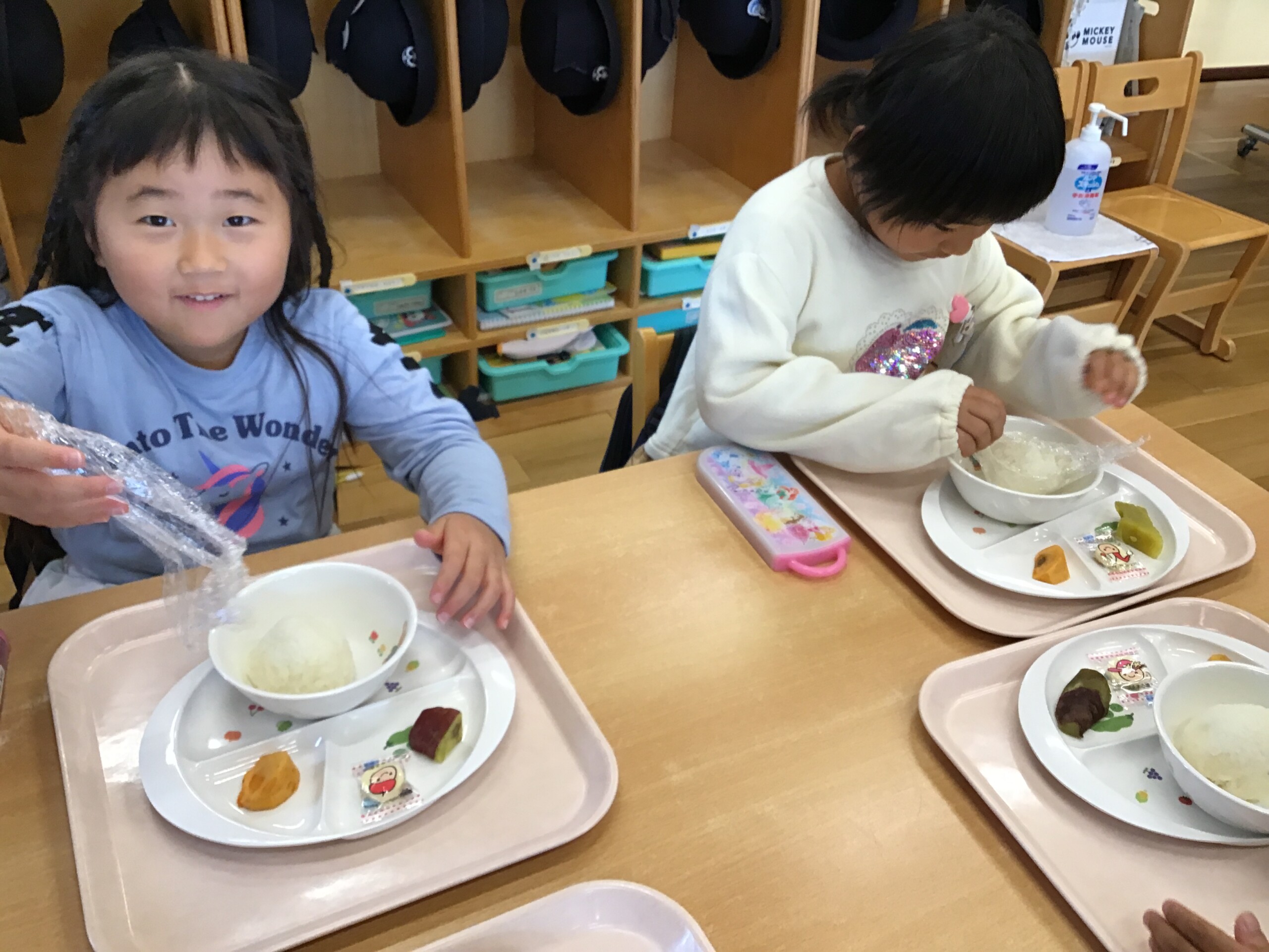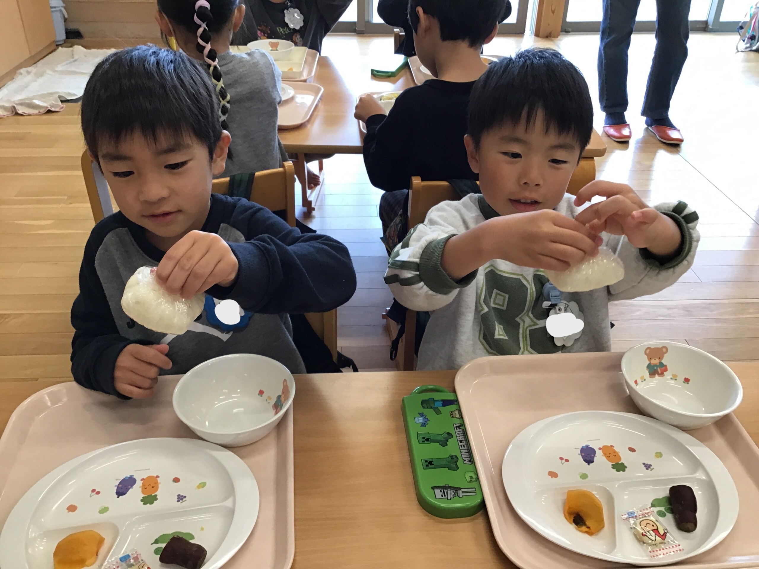 そして以上児さんはクッキングも行いました。つぼみ組、はな組はさつまいもの茶巾絞り🍠ほし組はおにぎりを作り🍙