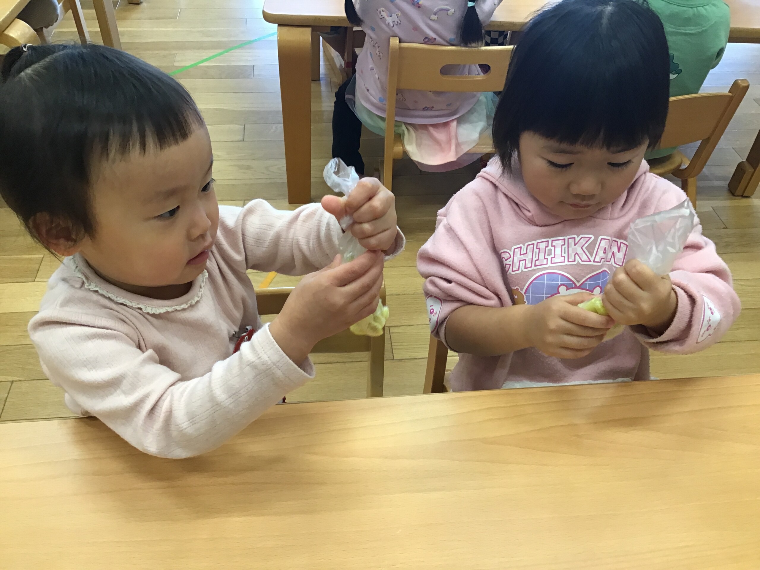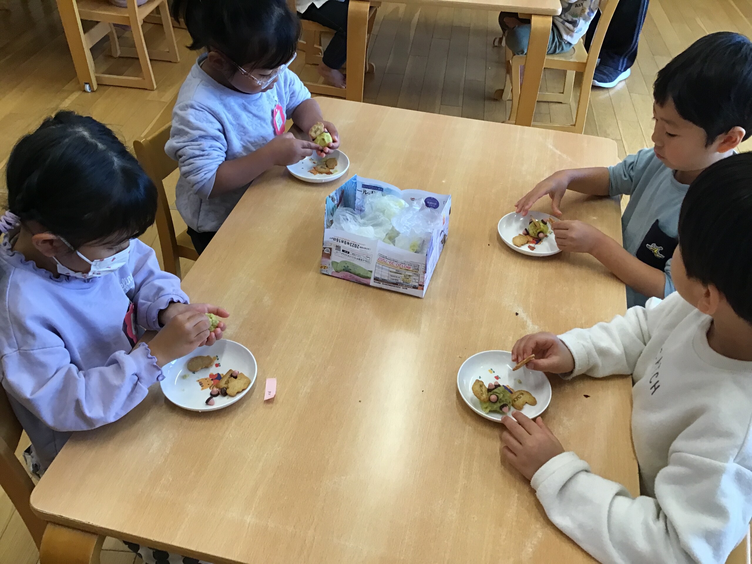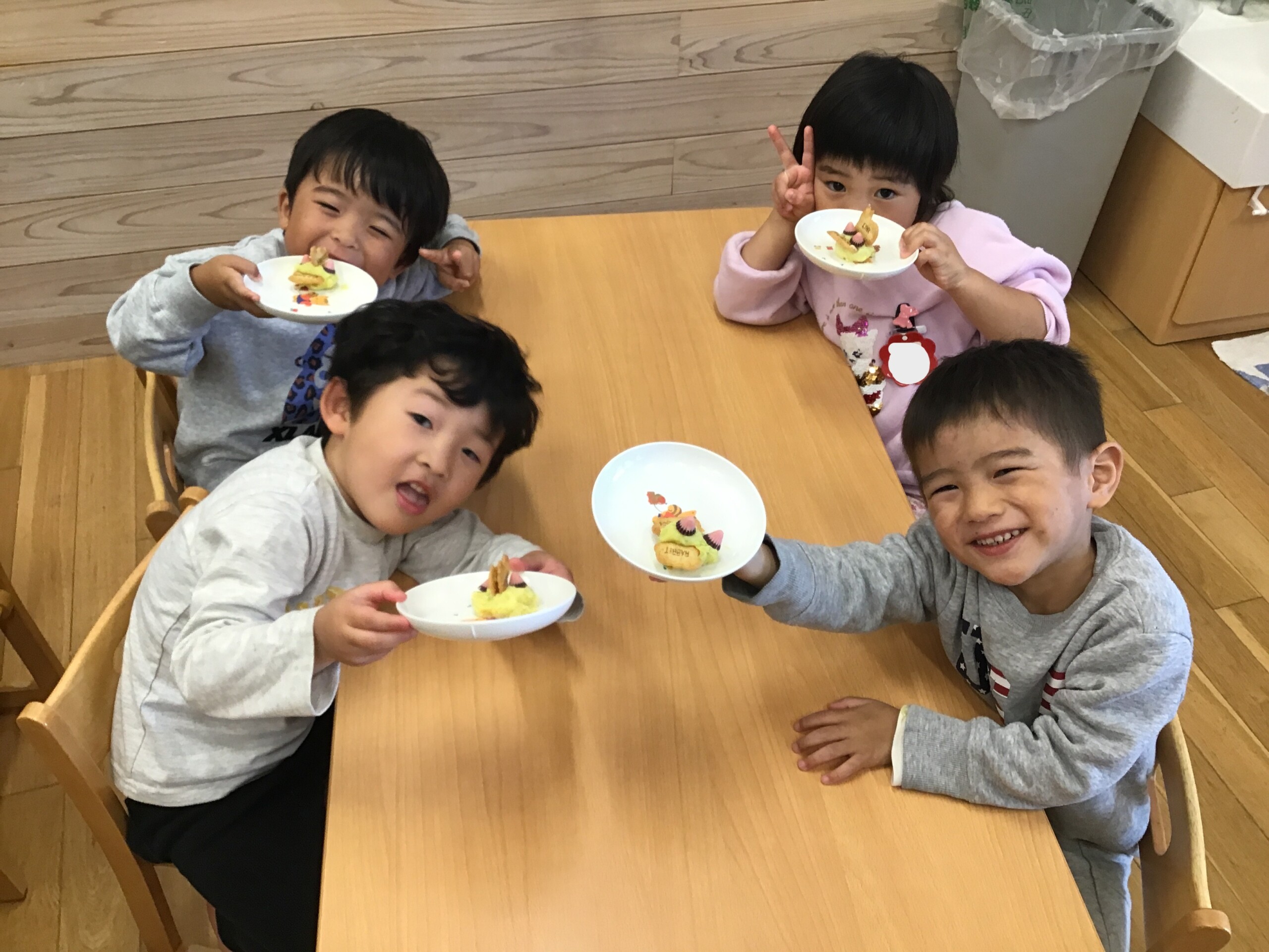 そして以上児さんはクッキングも行いました。つぼみ組、はな組はさつまいもの茶巾絞り🍠ほし組はおにぎりを作り🍙