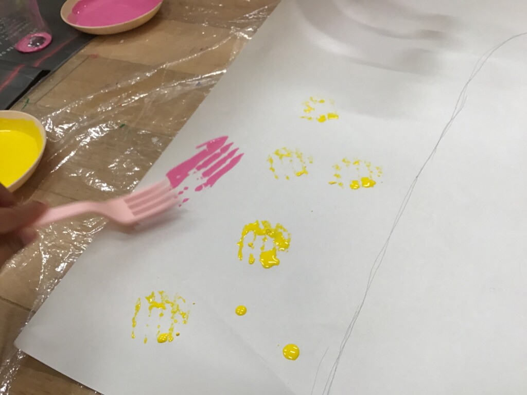 大きな紙にスタンプ遊びをしました。スタンプの材料はフォークやヤクルトの容器、果物のクッション材、綿棒等、様々な廃材を利用して 押しました。子ども達はワクワクしながらどんな風につくのかそっとひと押し・・・。もう一回ポン!顔が笑顔に(^^♪「今度はこっちでやりた~い!」「こっちの色でもやってみよ~っと♫」と夢中になってぺたぺたしましたよ✨