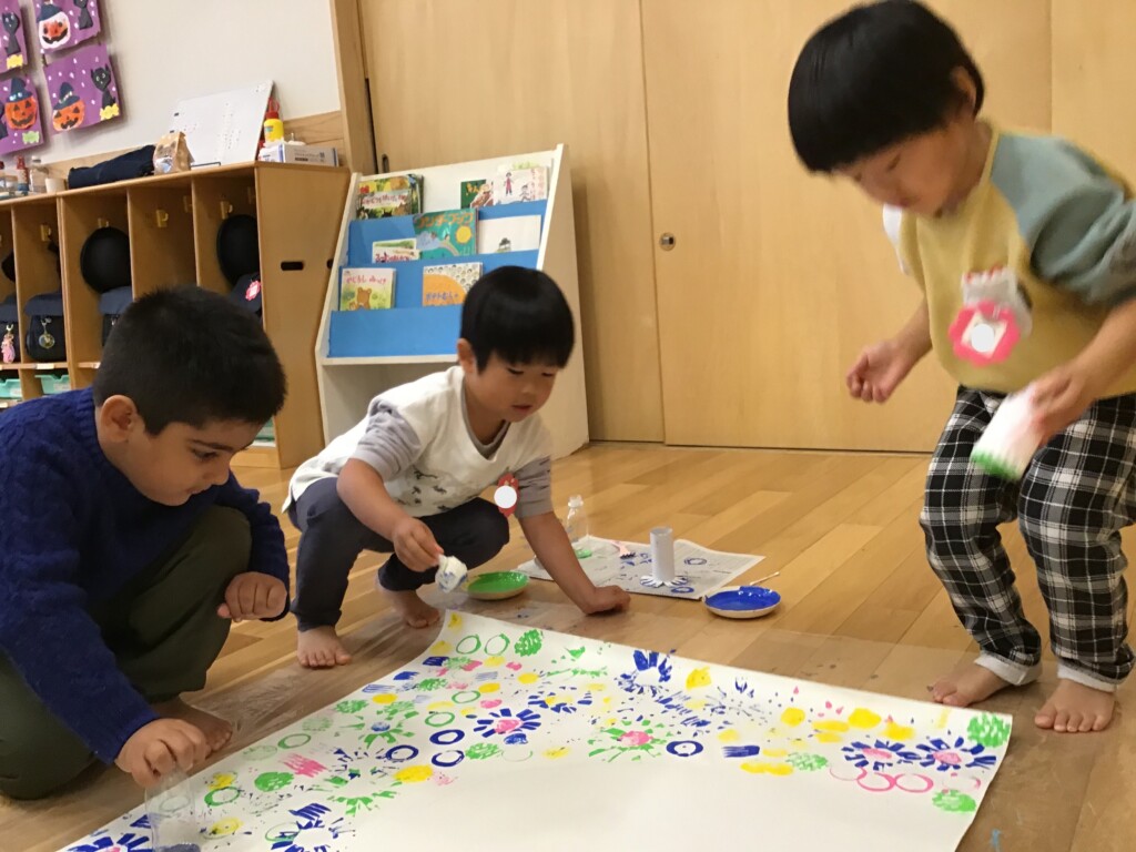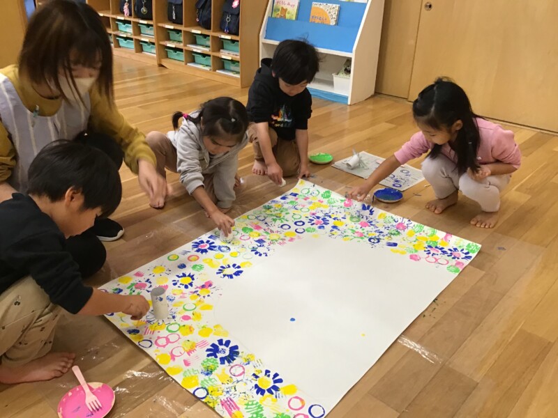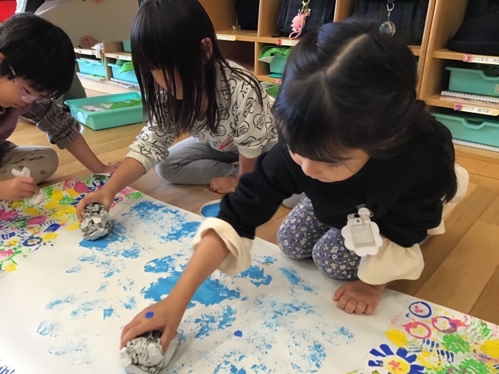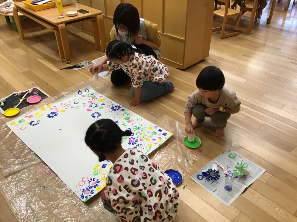 トイレットペーパーの芯のスタンプの中に丸いスタンプを押す子も出てきました。「たんぽぽみたい!」「黄緑は葉っぱみたいだね」と言いながら、みんなで順番に押すとあっという間にお花畑に・・・( *´艸`)