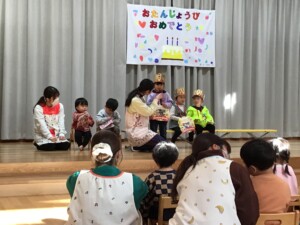 インタビューの後は、歌と言葉のプレゼントを皆からもらってからお家の人と写真撮影!先生達からのプレゼントはクリスマス発表会でつぼみ組が演じた劇「てぶくろ」の先生バージョンです。みんな知っているので踊ったり歌ったりと盛り上がりました。