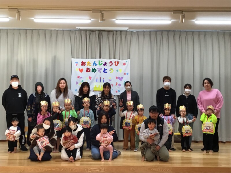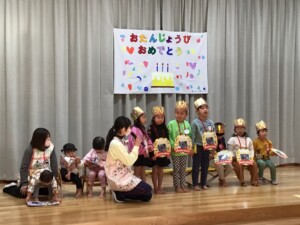 まずは1月生まれのお友達です。嬉しそうに舞台に上がるとさっそく誕生カードのプレゼントを貰います。未満児の子はアンパンマンのカードを落とさないようにぎゅっと握って、なにが描いてあるのか気になる様子(^^♪