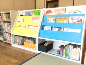 茶色の絵本棚は、水色と黄色に先生達でリメイクしました(^_^) 新しい絵本もたくさん増えましたよ。