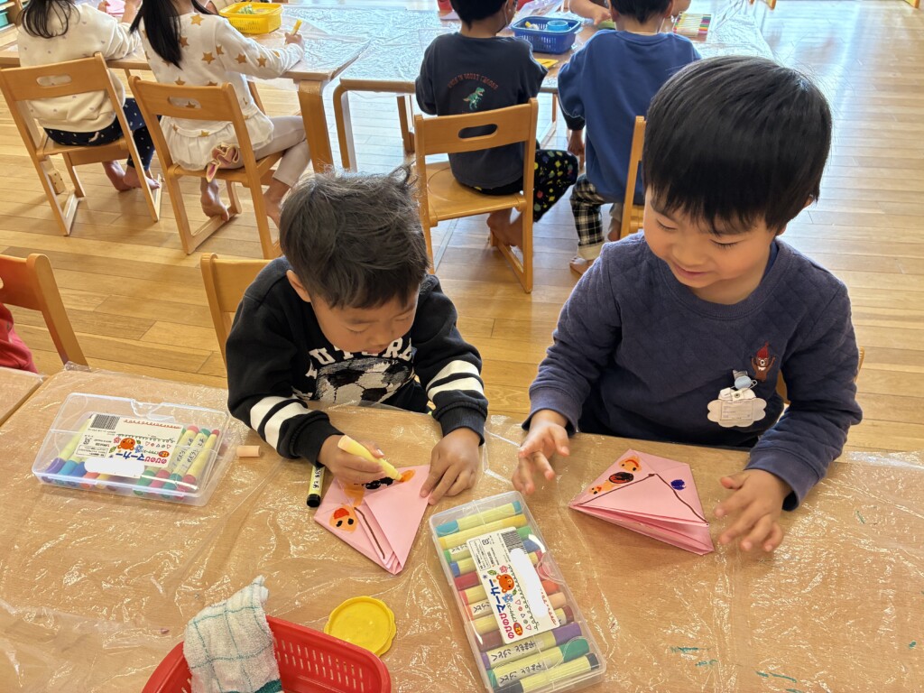 画用紙で折るのは初めてだったので、折り紙より苦戦してしまう子もいましたが、折り方を一つひとつ確認し、丁寧に折り進めることができました🌟