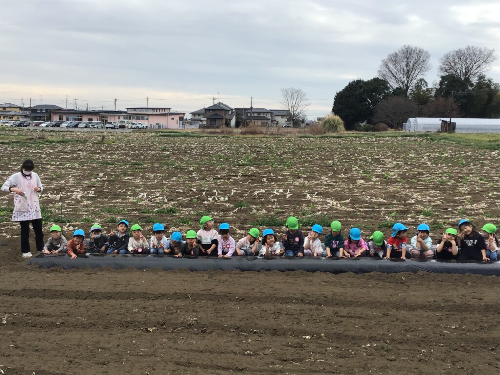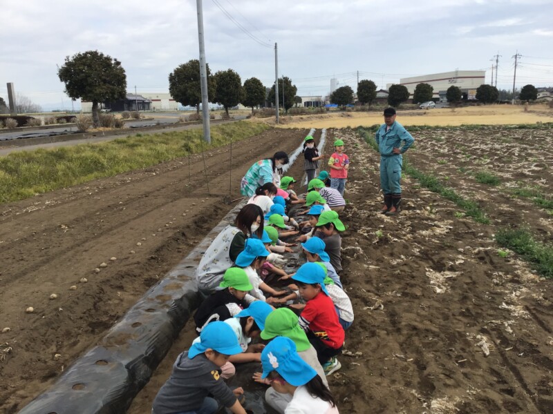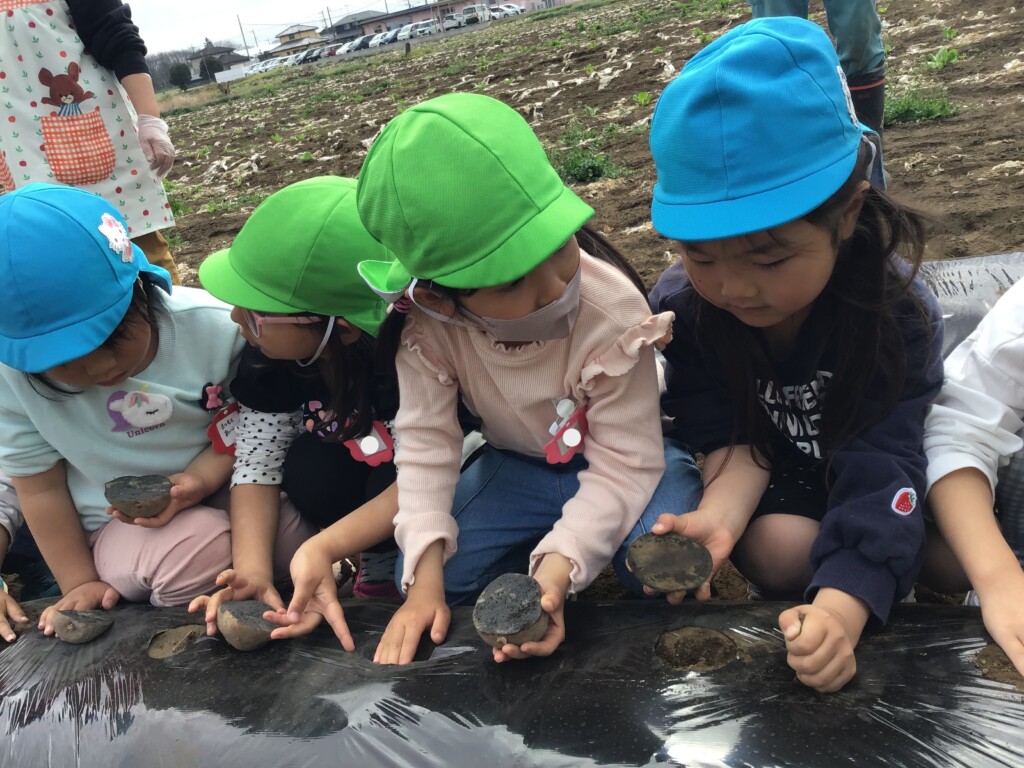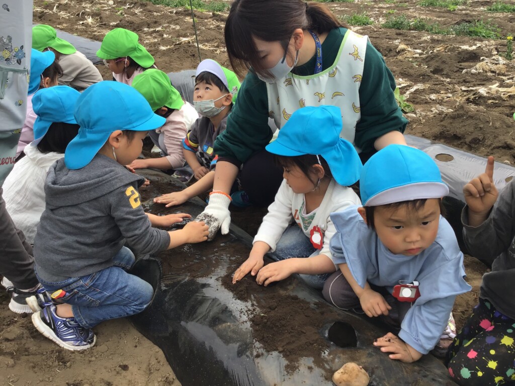 地主の飯村さんに植え方を教わり、子ども達の小さな手でそっと土を掘り起こし、じゃがいもを植えました。土のお布団を被せて、みんなで「おいしくな~れ、おいしくな~れ!!」のおまじないをかけました。「早く食べたくなっちゃうな」「もうお腹がすいてきちゃったよ」なんてくいしんぼさんの声が聞こえてきましたよ(^^♪