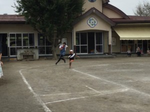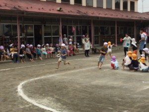 年長さんは、赤白好きなチームに分かれ先生たちも加わり勝負しました。やっぱり、みんな走るのが速い!!