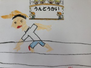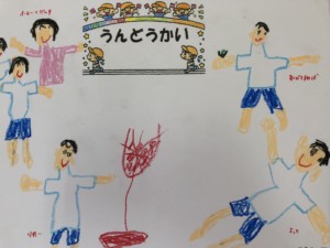 運動会で楽しかったこと・頑張ったことを描きました。年長さんでは、思い出がたくさんあり、みんな思い思い描いた絵を「これが、かけっこ。これがママとやったフォークダンス」と説明をしてくれました。かけっこで転んでしまったけど頑張る姿も伸び伸びと描いていました。