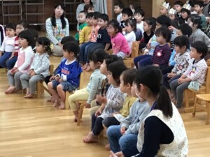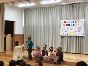 5月生まれのお友達のお誕生会を行いました。お父さんやお母さんが見に来てくれてみんなとっても嬉しそうにニコニコとインタビューに答えてくれました❤