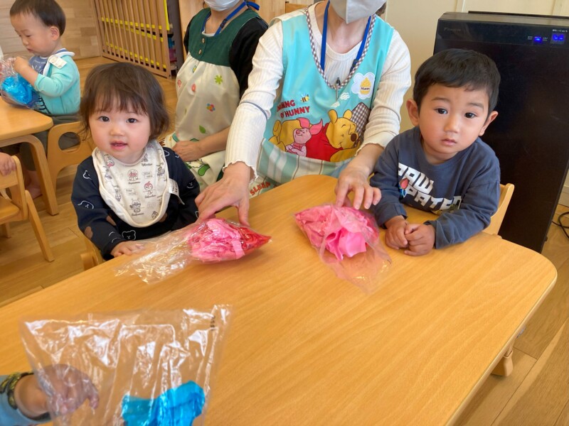 「こいのぼり制作🎏」みんなでお花紙をくるくると丸めました。ふわふわの感触が気持ちよかったね。くるくる丸めた紙は自分で袋に入れました。