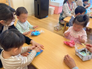 シール貼りは先生と一緒に…小さなおててでペタペタ貼る姿がとってもかわいらしいつくしさん。指にシールがくっついて困ってしまう子もいました。だんだん上手になってくるからね😊