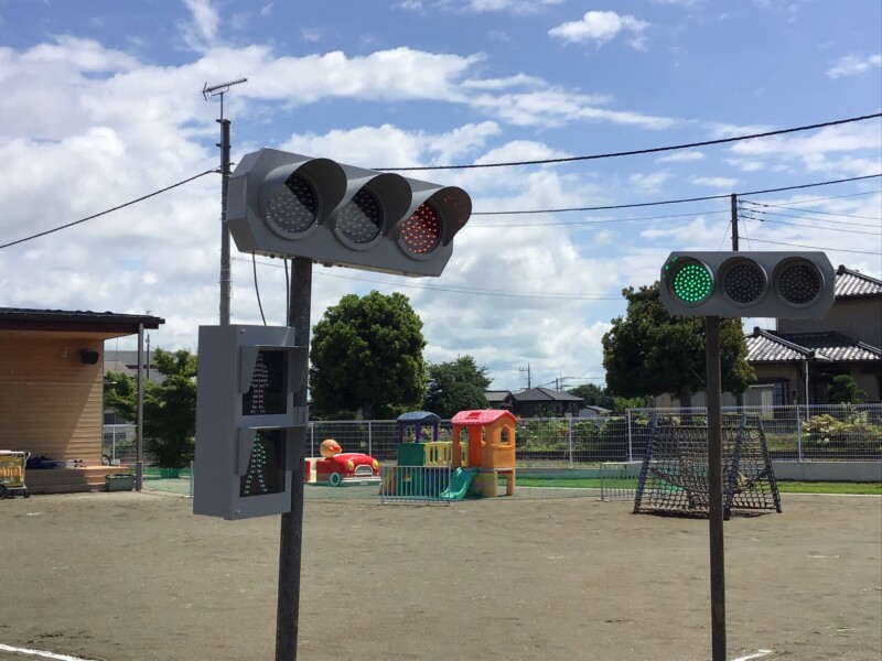 幼稚園の園庭で交通安全教室を行いました!信号機や道路の線が園庭に書いてあり、子ども達は「信号機が幼稚園にある~」と大興奮💖