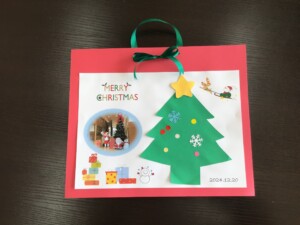大きなツリーの前で撮った写真と、自分で飾りつけしたツリーを貼ったものを一枚にしてプレゼント。お家に飾ってくださいね(*^^*)
