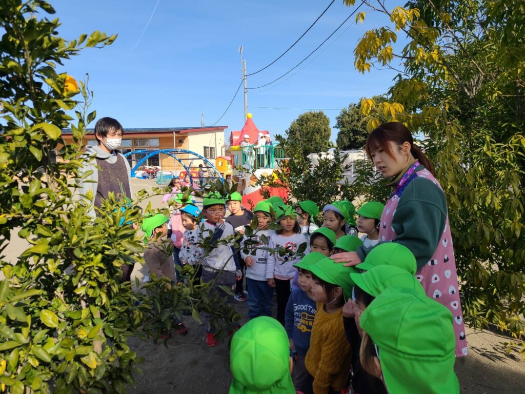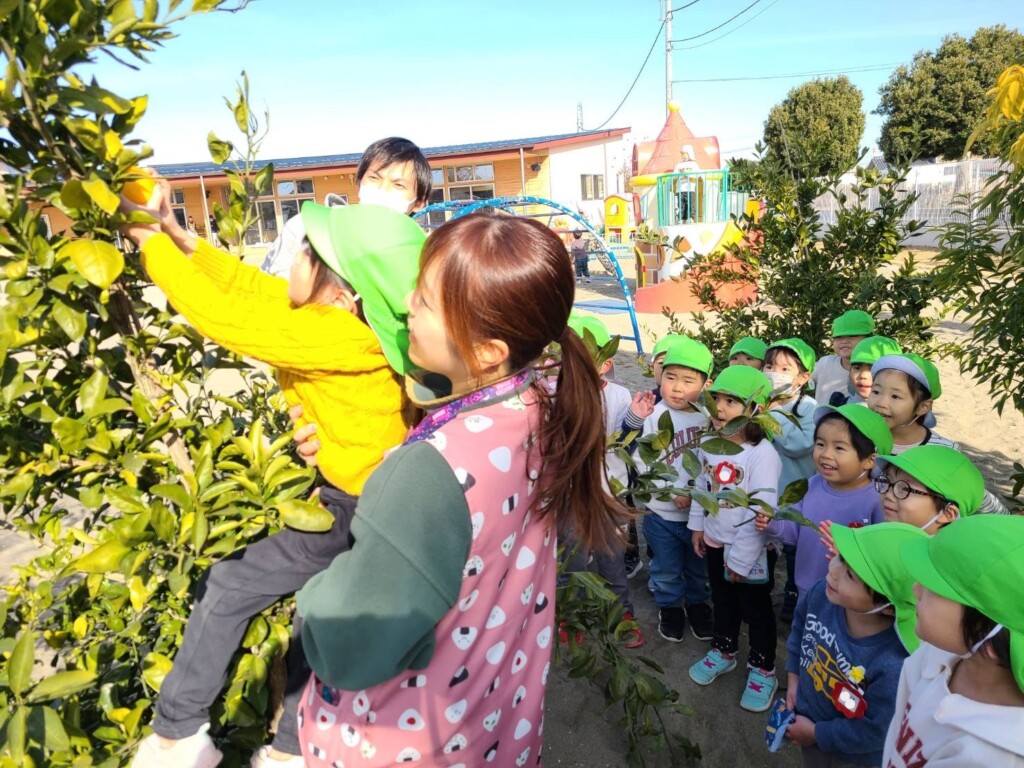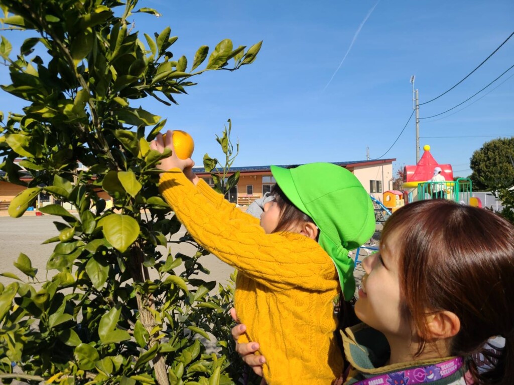 幼稚園のミカンの木においしそうなみかん発見!!緑色の時から楽しみに待っていてようやく収穫の時がきました。
