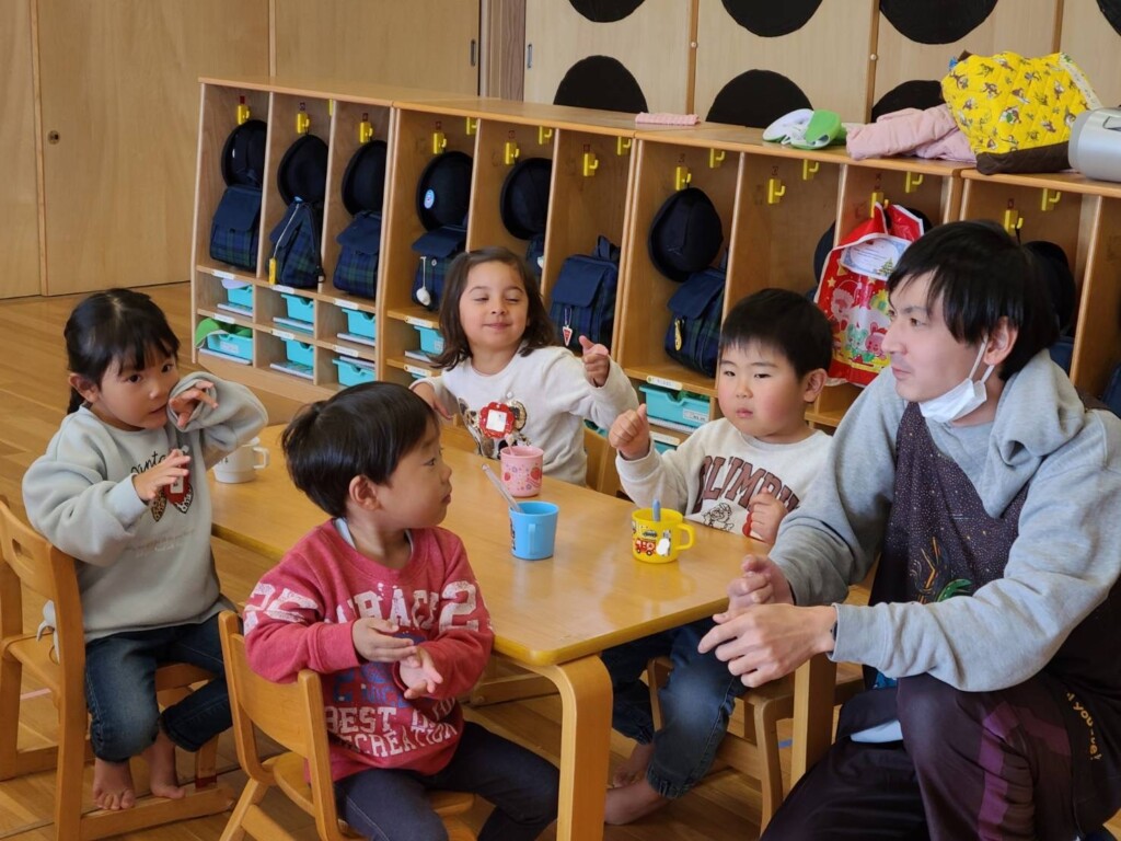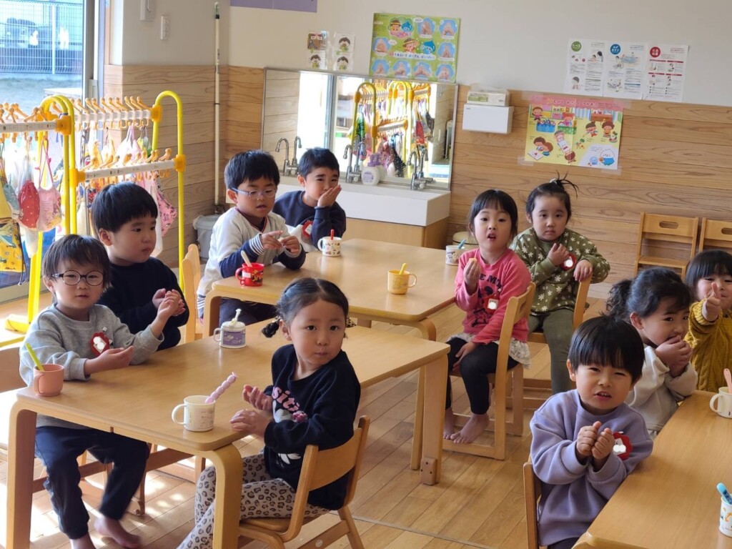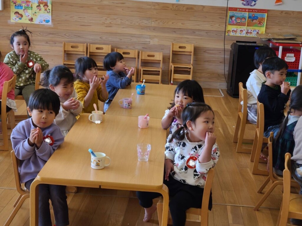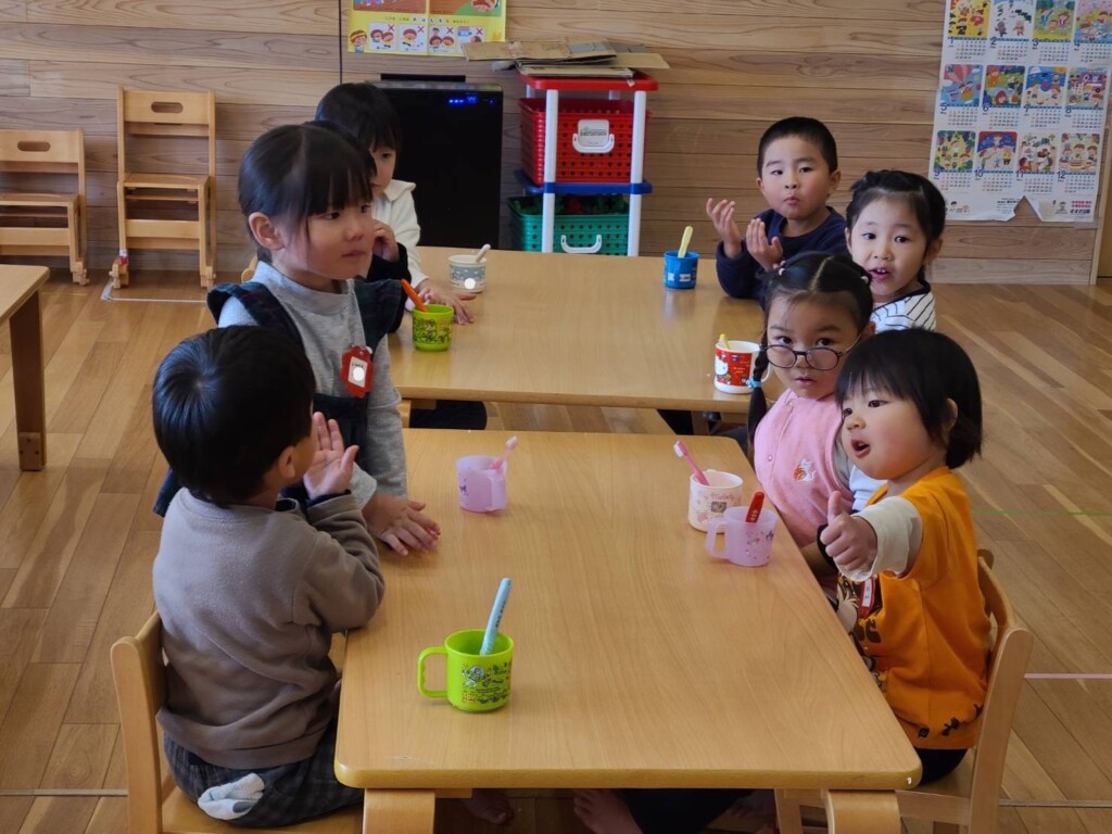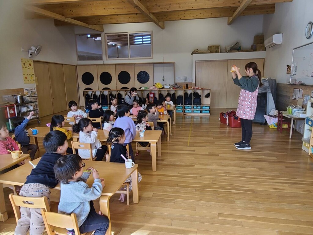 給食の後、つぼみ組さんで1個のミカンを食べることに😊